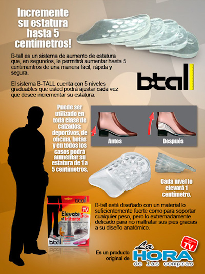 B-tall es un sistema de aumento de estatura que, en segundos, le permitirá aumentar hasta 5 centímetros de una manera fácil, rápida y segura