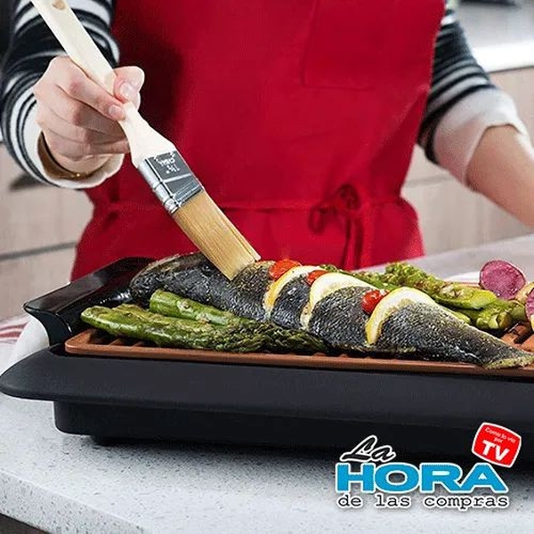 Es muy espaciosa, porque podrás fácilmente colocar muchos alimentos a la vez. Ya no más cocinar al carbón, esta grill te facilita la vida y reduce tus horas en la cocina, además de que cuidas de tu salud al cocinar de sin utilizar grasas y aceites.