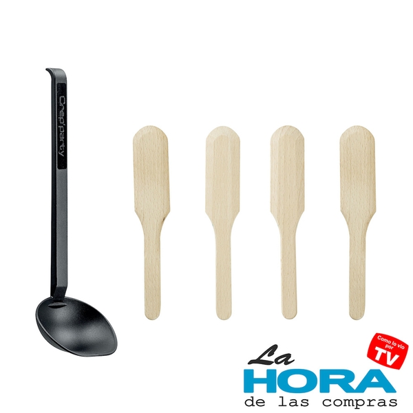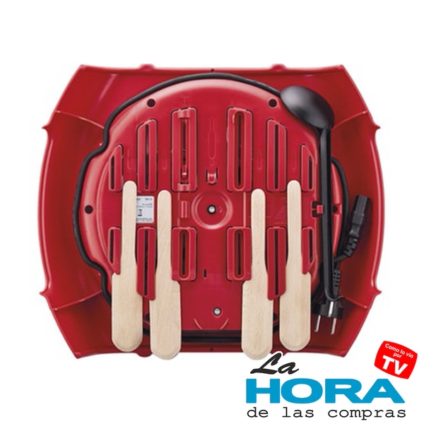 Con su potencia de 720 W, esta máquina está equipada con 4 espátulas y un cucharón, que se guardan en la parte inferior para no ocuparte nada de espacio. Además, su resistente revestimiento antiadherente lo hace muy fácil de limpiar.