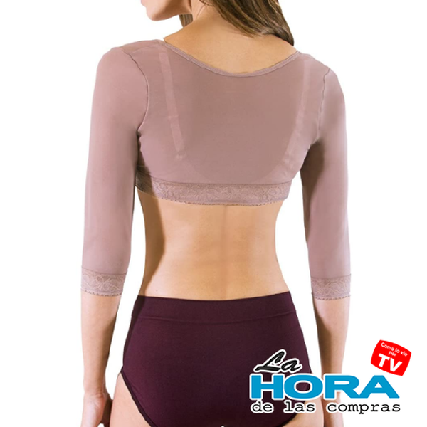 Brazalete con sistema de soporte en X en la espalda y cierre con broches al frente. Elaborado en Compress Net y encaje. Ideal para controlar 'gorditos' de los brazos y también Post-Cirugía.