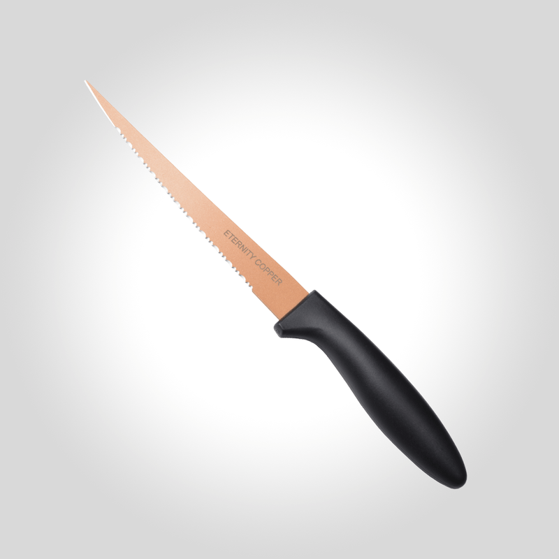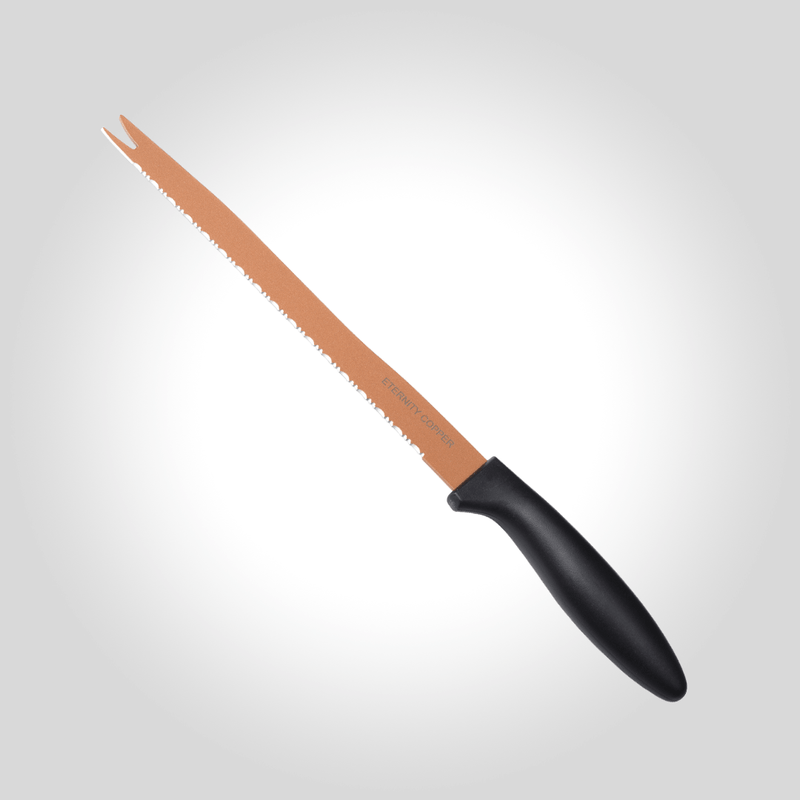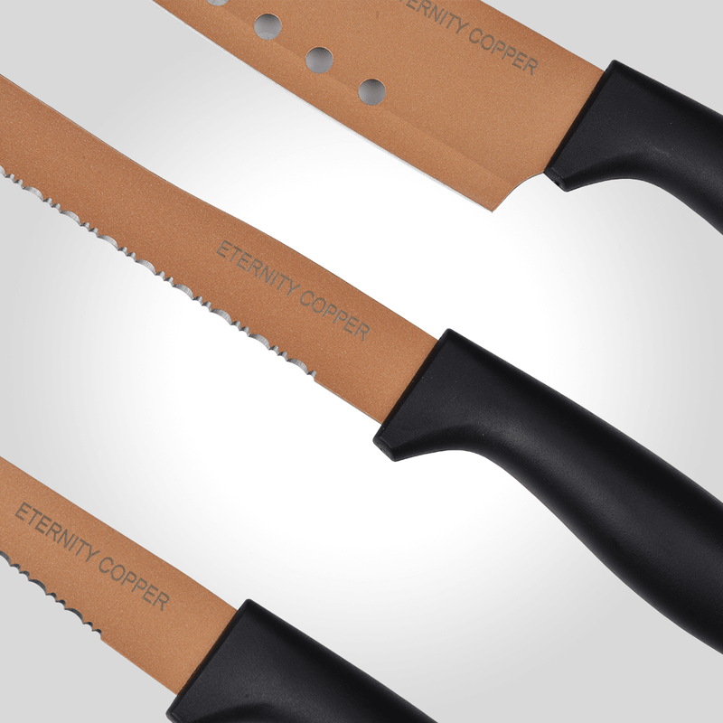 Con los cuchillos de Eternity Copper revestimiento de cobre, podrás cortar, rebanar y picar, mucho más fácil; Obteniendo cortes rápidos, precisos y sin esfuerzo en carnes, verduras, frutas, panes y muchos más alimentos.