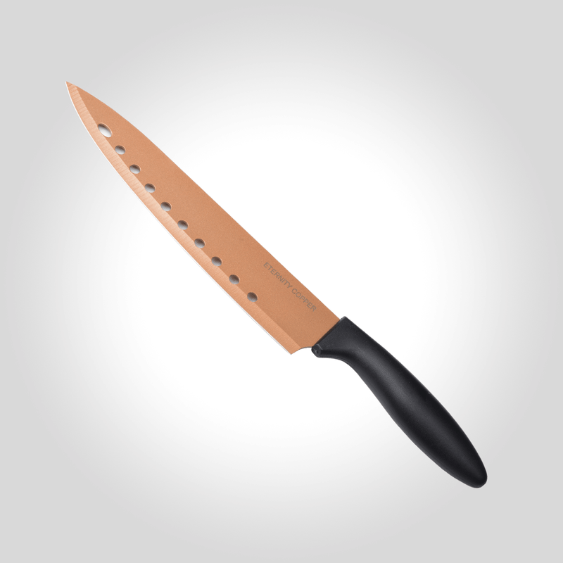 Además, su exclusivo mango ergonómico, se amolda a la mano para brindarte una experiencia única en cada corte. Con Eternity Copper, olvídate de esforzarte cuando corte los alimentos.