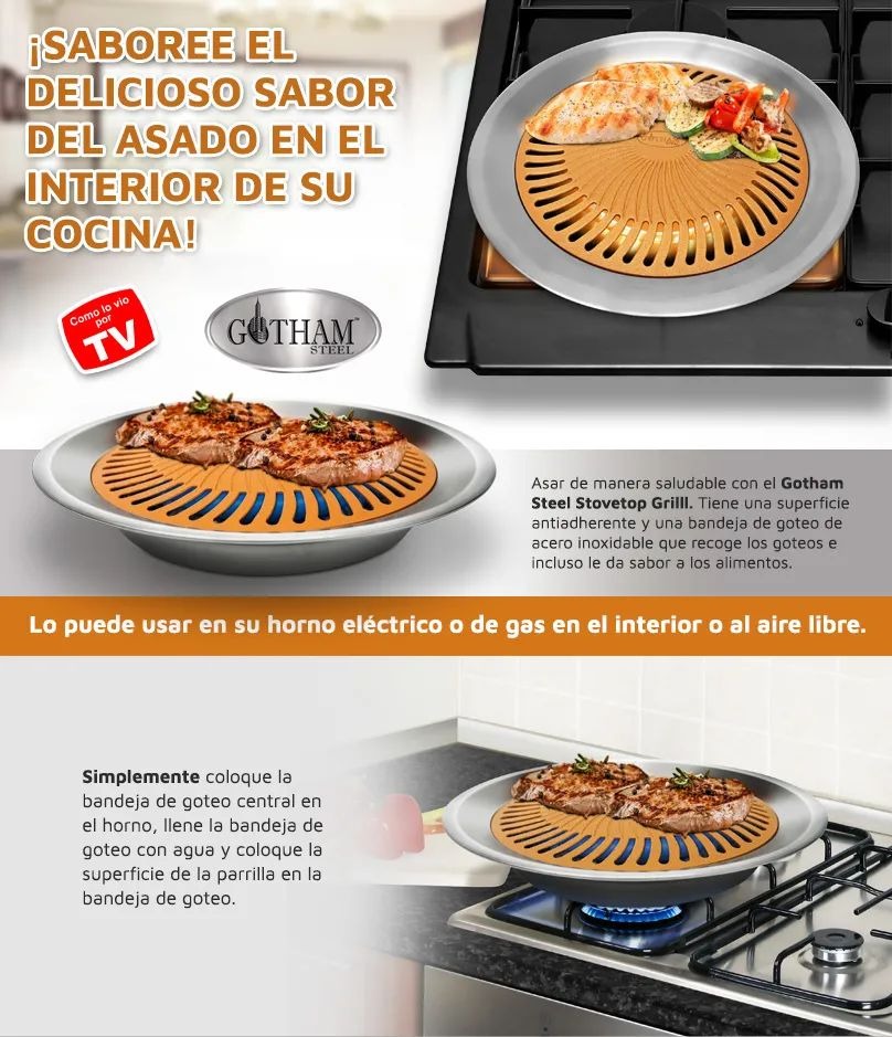 Asar de manera saludable con el Gotham Steel Stovetop Grilll. Tiene una superficie antiadherente y una bandeja de goteo de acero inoxidable que recoge los goteos e incluso le da sabor a los alimentos. Úselo en sus estufas eléctricas, de gas o de propano en el interior o al aire libre.