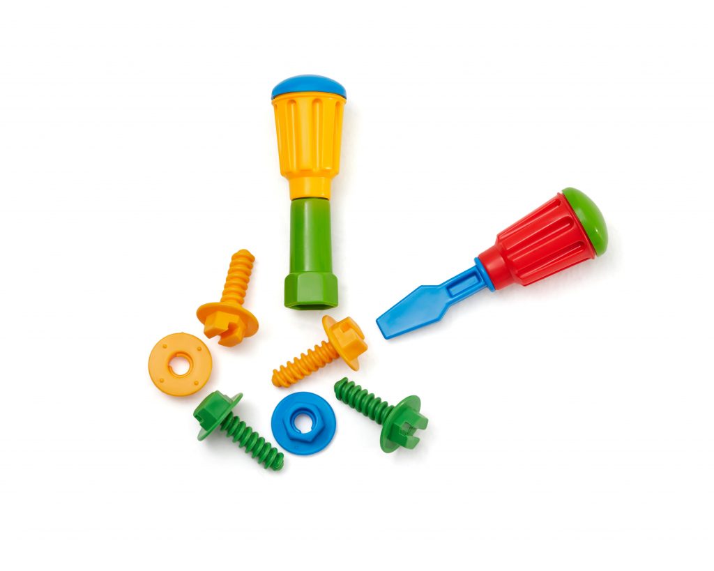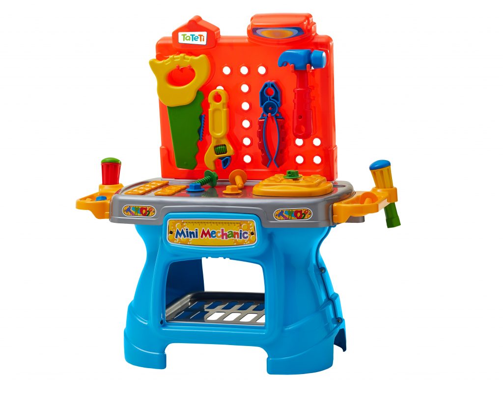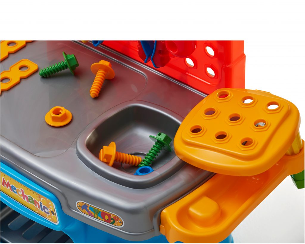 ¡Un banco de trabajo colorido equipado con muchas herramientas y accesorios! El juego consistirá en armar y desarmar, atornillar y aflojar tornillos y todo lo que la imaginación quiera. Estimula la creatividad, el razonamiento en la resolución de problemas. El kit viene con pinza, destornillador, llave inglesa, llave de tubo, serrucho que hace el mismo ruido que el real, martillo, tornillos y tuercas.Contiene: