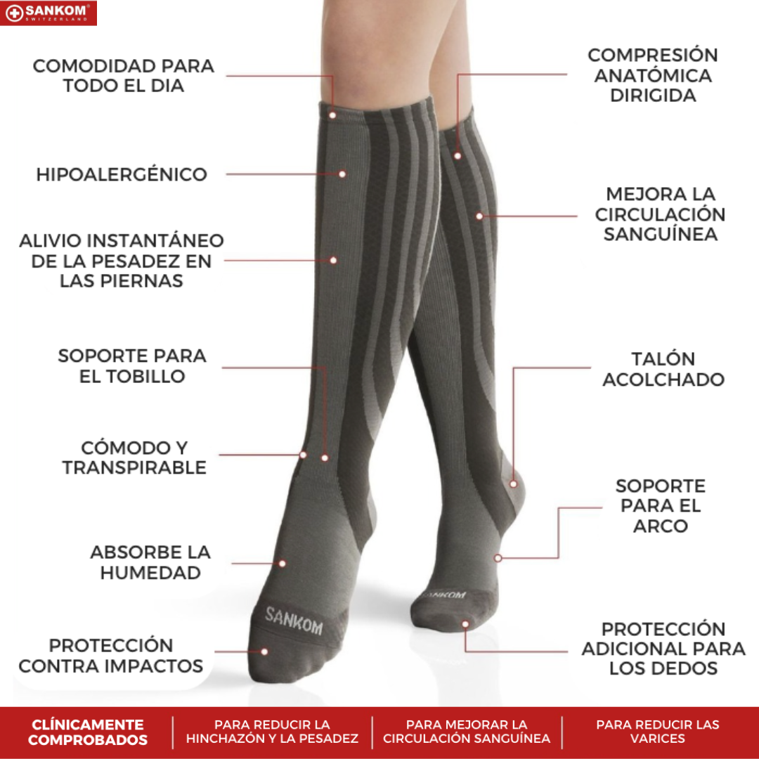 A diferencia de las medias comunes, las medias de compresión Sankom están clínicamente comprobadas para mejorar tu circulación desde el primer uso. ¡Y son tan fáciles de usar que te olvidarás de lo que es sentir las piernas pesadas!