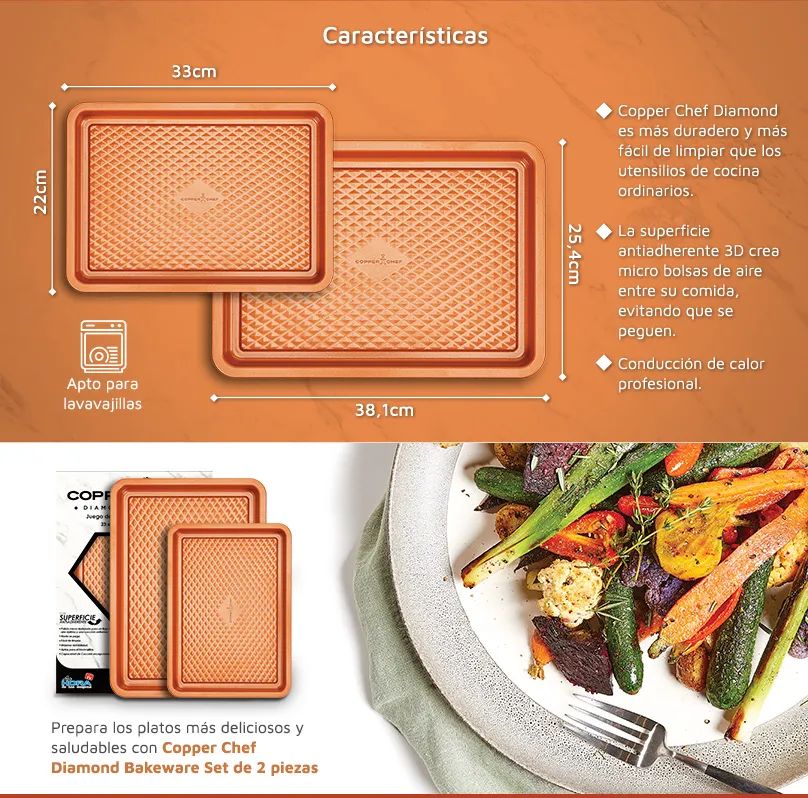 Copper Chef Diamond Bakeware Set de 2 piezas, es perfecta para preparar comidas sin que se peguen y pierdan el sabor. Ahora podrás tener lo que tanto querías para tu cocina.