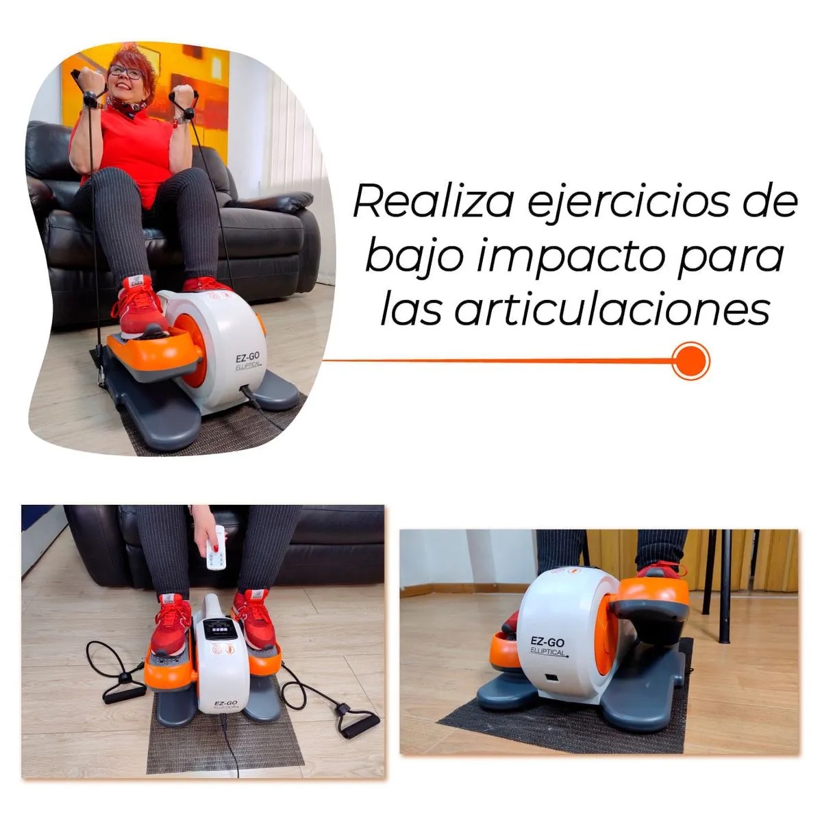 Su funcionamiento es silencioso, estable y cómodo, permitiendo usarlo desde una silla, sillón o incluso en la oficina. Incluye bandas elásticas para brazos, que ayudan a activar suavemente el tren superior, favoreciendo la coordinación y el movimiento integral del cuerpo.