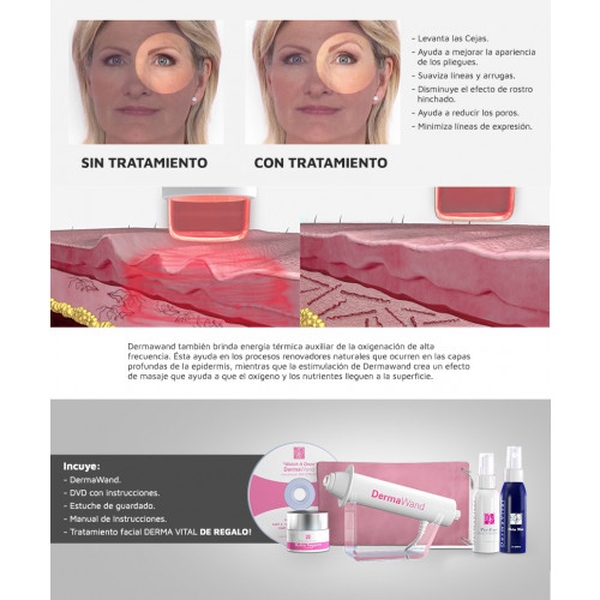 Dermawand también brinda energía térmica auxiliar de la oxigenación de alta frecuencia. Ésta ayuda en los procesos renovadores naturales que ocurren en las capas profundas de la epidermis, mientras que la estimulación de Dermawand crea un efecto de masaje que ayuda a que el oxígeno y los nutrientes llegues a la superficie.