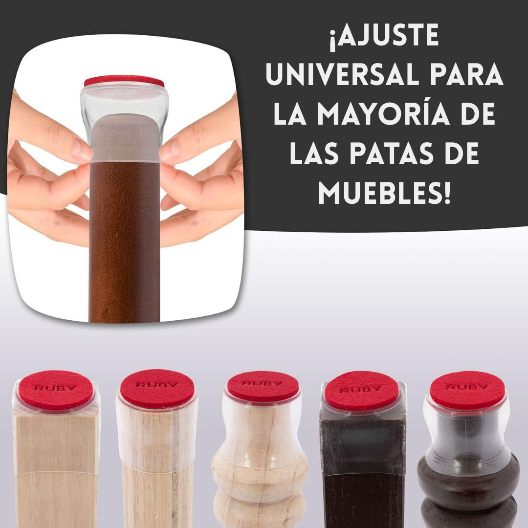 Ruby Sliders son protectores universales para patas de muebles que evitan rayones, marcas y ruidos al mover sillas, camas o mesas. Se ajustan fácilmente sin pegamento y se deslizan suavemente sobre cualquier superficie, cuidando tus pisos, paredes y muebles.